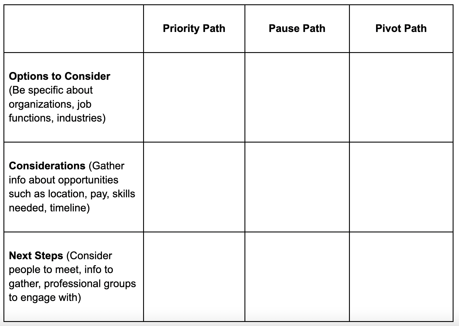 Identify options and next steps. Use the chart below to identify options, considerations, and potential next steps for each of the paths.